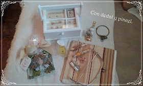 Y estos son los regalos que recibí por mi cumple - blog. Un gran retal de tela, una anilla para hacerme un llavero de patchwork, un precioso llavero de abalorios y pompones realizado por ella, varias puntillas y carretes de hilo, un anillo en forma de flor, un boquilla para realizarme un bolso y ese magnifico y precioso costurero el cual ya tengo lleno con mis cosita de costura. También nos entregó a mi marido y a mi los detalles que había dado en la comunión de su hija María. Para él una botellita de licor y para mi una bandejita de cristal realizada en decoupage con una lindisima carita decorativa para colocar en cualquier tirador de armario.